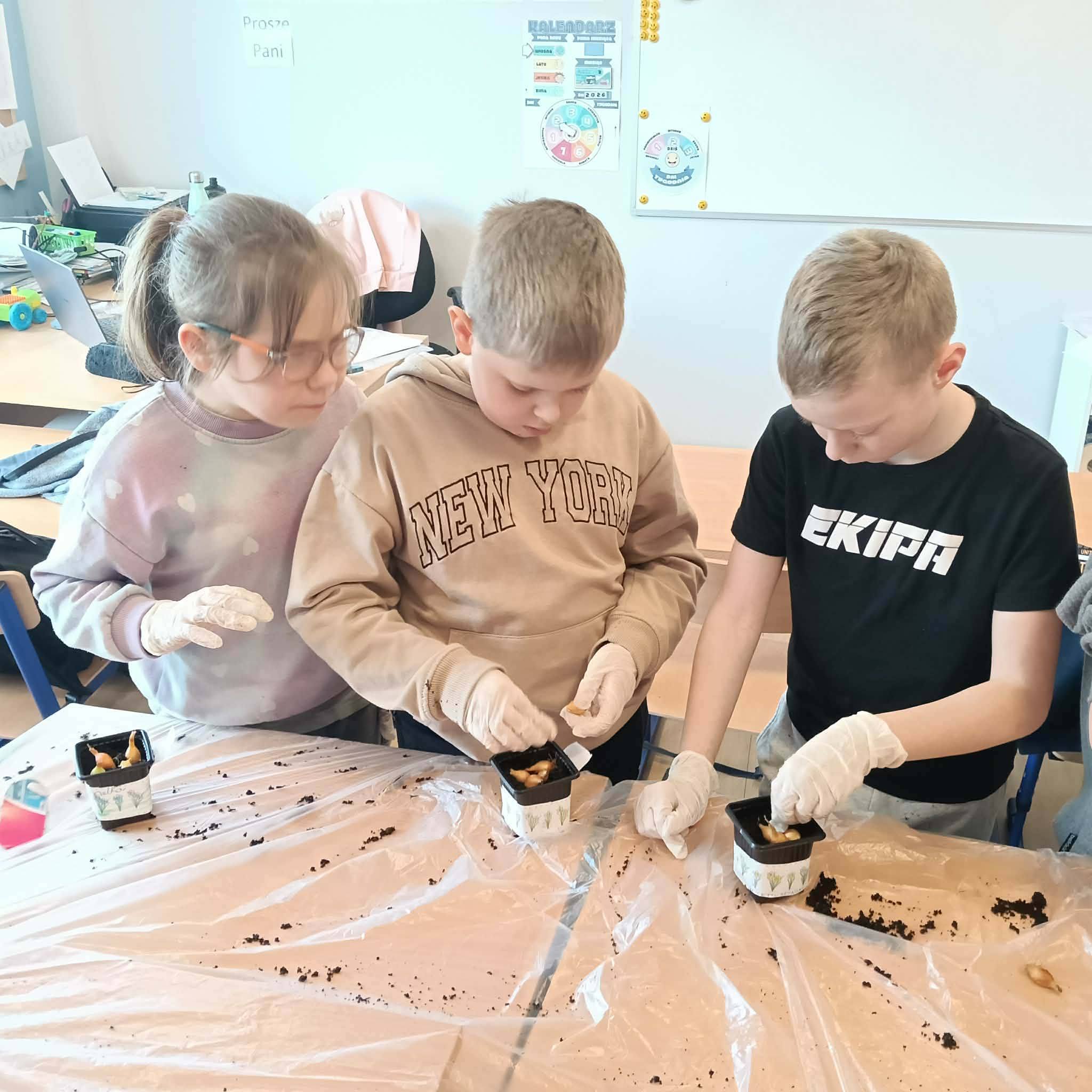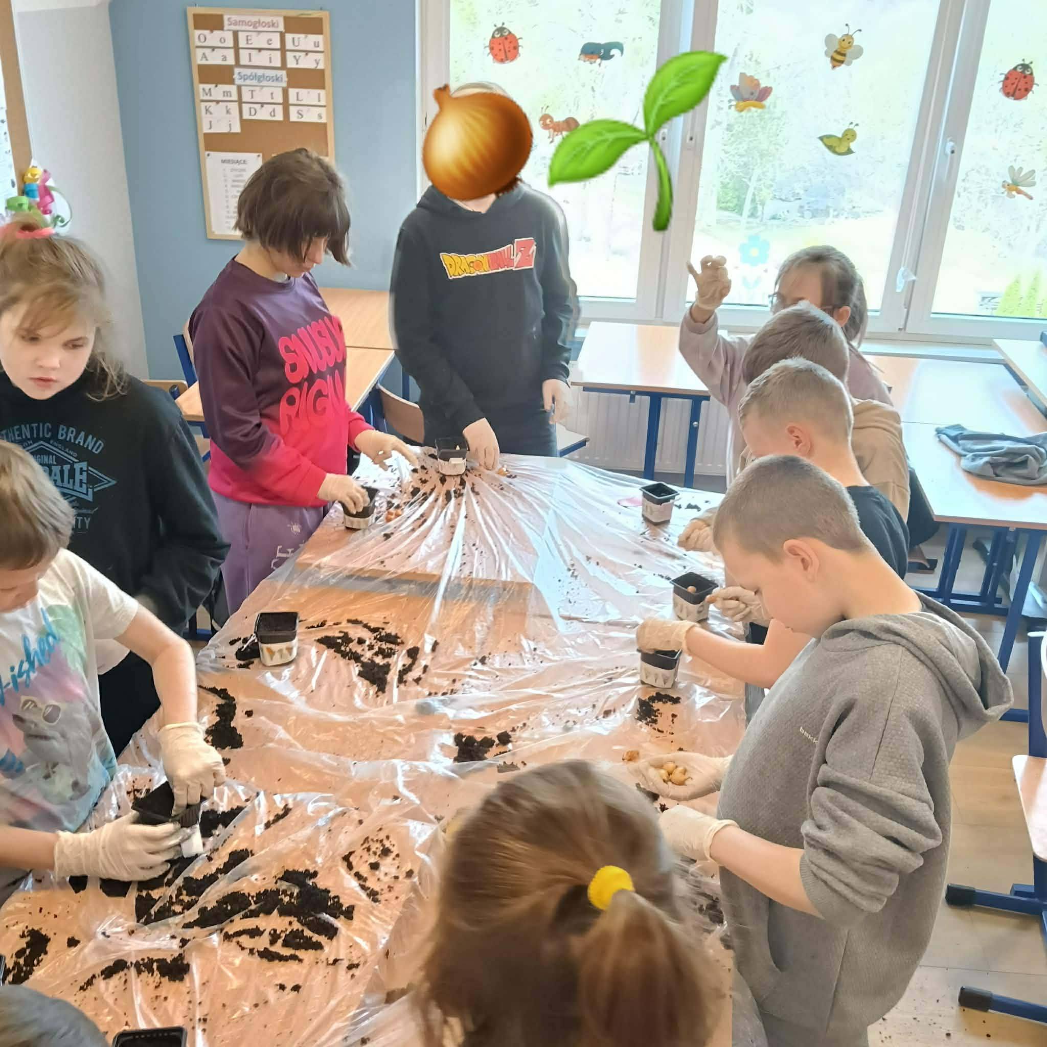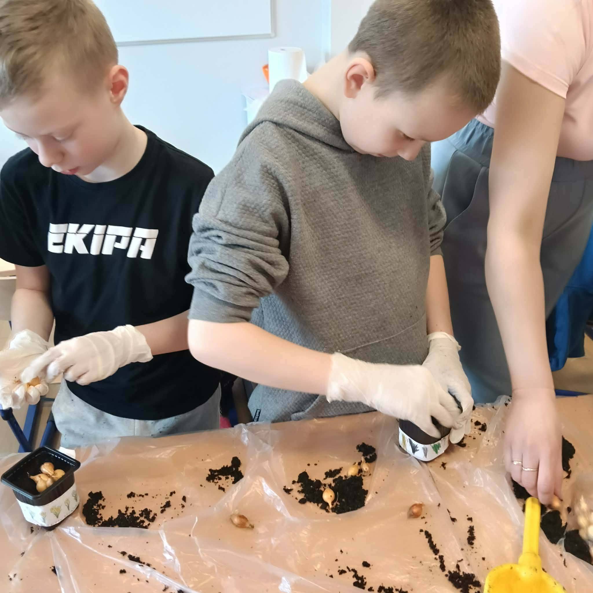 Z ogromnym zaangażowaniem sadzili cebulki, z których już niedługo wyrośnie świeży, zielony szczypiorek